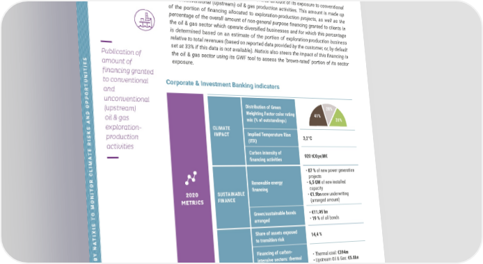 TCFD REPORT 2021 TACKLING CLIMATE CHANGE 55 METRICS AND TARGETS USED BY NATIXIS TO MONITOR CLIMATE RISKS AND OPPORTUNITIES Natixis publishes two separate sub-indicators: 1. Thermal coal financing: since 2019, Natixis has published a thermal coal sector financing indicator in its annual report. This indicator includes all corporate financing to clients whose thermal coal activity represents less than 25% of revenue. Any financing that is higher is excluded from Natixis’ coal policy. The financing of clients operating in the coal sector is revenue-weighted. The data source used for this calculation is S&P Trucost. 2. Oil & Gas financing: Natixis reports the overall amount of its exposure to conventional and unconventional (upstream) oil & gas production activities. This amount is made up of the portion of financing allocated to exploration-production projects, as well as the percentage of the overall amount of non-general purpose financing granted to clients in the oil & gas sector which operate diversified businesses and for which this percentage is determined based on an estimate of the portion of exploration-production business relative to total revenues (based on reported data provided by the customer, or, by default set at 33% if this data is not available). Natixis also steers the impact of this financing in the oil & gas sector using its GWF tool to assess the 'brown-rated' portion of its sector exposure. Corporate & Investment Banking indicators CLIMATE IMPACT Distribution of Green Weighting Factor color rating mix (% of outstandings) Implied Temperature Rise (ITR) 3,2°C Carbon intensity of financing activities 920 tCO 2 e/M€ SUSTAINABLE FINANCE Renewable energy financing • 87 % of new power generation projects • 6,5 GW of new installed capacity • €1.9bn new underwriting (arranged amount) Green/sustainable bonds arranged • €11.95 bn • 19 % of all bonds TRANSITION RISK Share of assets exposed to transition risk 14,4 % Financing of carbon- intensive sectors: thermal coal and oil & gas • Thermal coal: €394m • Upstream Oil & Gas: €5.8bn Share of Oil & Gas exposure rated “brown” with GWF methodology (% of oustandings) 76 % Publication of amount of financing granted to conventional and unconventional (upstream) oil & gas exploration- production activities 2020 METRICS 27 % 41 % 52% 31% 21 % 38 % 41% 31% 28%