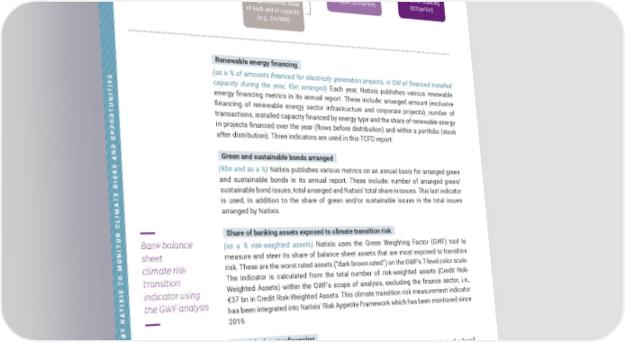 TCFD REPORT 2021 TACKLING CLIMATE CHANGE 54 METRICS AND TARGETS USED BY NATIXIS TO MONITOR CLIMATE RISKS AND OPPORTUNITIES Renewable energy financing (as a % of amounts financed for electricity generation projects, in GW of financed installed capacity during the year, €bn arranged) Each year, Natixis publishes various renewable energy financing metrics in its annual report. These include: arranged amount (exclusive financing of renewable energy sector infrastructure and corporate projects), number of transactions, installed capacity financed by energy type and the share of renewable energy in projects financed over the year (flows before distribution) and within a portfolio (stock after distribution). Three indicators are used in this TCFD report. Green and sustainable bonds arranged (€bn and as a %) Natixis publishes various metrics on an annual basis for arranged green and sustainable bonds in its annual report. These include: number of arranged green/ sustainable bond issues, total arranged and Natixis’ total share in issues. This last indicator is used, in addition to the share of green and/or sustainable issues in the total issues arranged by Natixis. Share of banking assets exposed to climate transition risk (as a % risk-weighted assets) Natixis uses the Green Weighting Factor (GWF) tool to measure and steer its share of balance sheet assets that are most exposed to transition risk. These are the worst rated assets (“dark brown rated”) on the GWF’s 7-level color scale. The indicator is calculated from the total number of risk-weighted assets (Credit Risk- Weighted Assets) within the GWF’s scope of analysis, excluding the finance sector, i.e., €37 bn in Credit Risk-Weighted Assets. This climate transition risk measurement indicator has been integrated into Natixis’ Risk Appetite Framework which has been monitored since 2019. Fossil fuel sector financing (in billions of euros of outstandings) Total aggregated gross portfolio financing in the fossil fuel sector, including dedicated-purpose financing (projects and assets) and general- purpose financing for corporate clients actively operating in the sector. The scope for this indicator is global on the entire banking balance sheet, i.e., €234 bn in outstandings as of 12/31/2020. Bank balance sheet climate risk transition indicator using the GWF analysis Carbon intensity per €m of financing (tCO 2 e/€m) Physical carbon intensity of the asset (e.g., tCO 2 e/kWh) Annual activity of typical asset (e.g., kWh) Annual carbon intensity of asset per €m of capex (tCO 2 e/€m) Annual carbon footprint of asset per unit of capacity (e.g., tCO 2 e/ MW) Average economic value of each unit of capacity (e.g., €m/MW)