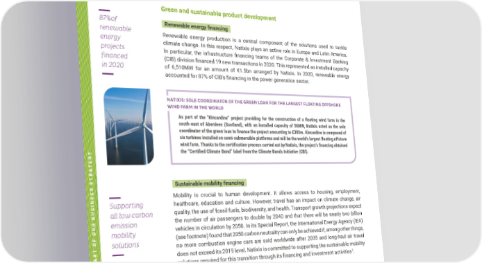 TCFD REPORT 2021 TACKLING CLIMATE CHANGE 21 PUTTING CLIMATE AT THE HEART OF OUR BUSINESS STRATEGY In the context of the BPCE 2024 strategic plan, GWF has made it possible to measure climate impact and set targets for all the activities within the scope of Corporate & Investment Banking. GWF has also helped to apply these targets to each of the large key sectors (8 industries) and geographical platforms (EMEA, Asia and the Americas) using two indicators: the GWF score mix and a temperature gauge. The GWF also calculates financing footprint in absolute terms and carbon intensity on a line-by-line basis within the same scope. Green and sustainable product development Renewable energy financing Renewable energy production is a central component of the solutions used to tackle climate change. In this respect, Natixis plays an active role in Europe and Latin America. In particular, the infrastructure financing teams of the Corporate & Investment Banking (CIB) division financed 19 new transactions in 2020. This represented an installed capacity of 6,510MW for an amount of €1.5bn arranged by Natixis. In 2020, renewable energy accountedfor87%ofCIB’sfinancinginthepowergenerationsector. NATIXIS: SOLE COORDINATOR OF THE GREEN LOAN FOR THE LARGEST FLOATING OFFSHORE WIND FARM IN THE WORLD As part of the “Kincardine” project providing for the construction of a floating wind farm in the south-east of Aberdeen (Scotland), with an installed capacity of 50MW, Natixis acted as the sole coordinator of the green loan to finance the project amounting to £380m. Kincardine is composed of six turbines installed on semi-submersible platforms and will be the world’s largest floating offshore wind farm. Thanks to the certification process carried out by Natixis, the project’s financing obtained the “Certified Climate Bond” label from the Climate Bonds Initiative (CBI). Sustainable mobility financing Mobility is crucial to human development. It allows access to housing, employment, healthcare, education and culture. However, travel has an impact on climate change, air quality, the use of fossil fuels, biodiversity, and health. Transport growth projections expect the number of air passengers to double by 2040 and that there will be nearly two billion vehicles in circulation by 2050. In its Special Report, the International Energy Agency (IEA) (see footnote) found that 2050 carbon neutrality can only be achieved if, among other things, no more combustion engine cars are sold worldwide after 2035 and long-haul air travel does not exceed its 2019 level. Natixis is committed to supporting the sustainable mobility solutionsrequiredforthistransitionthroughitsfinancingandinvestmentactivities 1 . 87%of renewable energy projects financed in 2020 1. Publication de l'AIE (mai 2021), Net Zero by 2050 A Roadmap for the Global Energy Sector https://iea.blob.core.windows.net/assets/beceb956-0dcf-4d73-89fe-1310e304 Supporting all low carbon emission mobility solutions