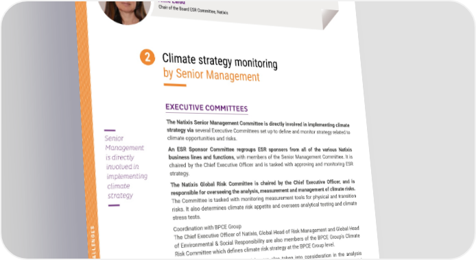8 GOVERNANCE OF CLIMATE CHALLENGES TCFD REPORT 2021 TACKLING CLIMATE CHANGE Climate strategy monitoring by Senior Management EXECUTIVE COMMITTEES The Natixis Senior Management Committee is directly involved in implementing climate strategy via several Executive Committees set up to define and monitor strategy related to climate opportunities and risks. An ESR Sponsor Committee regroups ESR sponsors from all of the various Natixis business lines and functions, with members of the Senior Management Committee. It is chaired by theChief Executive Officer and is tasked with approving and monitoring ESR strategy. The Natixis Global Risk Committee is chaired by the Chief Executive Officer, and is responsible for overseeing the analysis, measurement and management of climate risks. The Committee is tasked with monitoring measurement tools for physical and transition risks. It also determines climate risk appetite and oversees analytical testing and climate stress tests. Coordination with BPCE Group The Chief Executive Officer of Natixis, Global Head of Risk Management and Global Head of Environmental & Social Responsibility are also members of the BPCE Group’s Climate RiskCommitteewhichdefinesclimateriskstrategyattheBPCEGrouplevel. ESG risks, in particular climate risks, are also taken into consideration in the analysis and decisions made by the main Executive Committees which approve the financial commitments of Natixis, particularly the Natixis Credit Committee, which approves financing transactions and uses climate risk assessment tools (Green Weighting Factor, ESR Screening tool) and the Natixis Investment Managers (NIM) Committee which approves seed money invested in creation funds. Senior Management is directly involved in implementing climate strategy 2 As social organizations, companies have a major role to play in supporting more sustainable societal development which is more respectful of our planet. Working through its ESR Committee, Natixis ensures that ESG criteria are taken into consideration in the development of its business lines as well as in overall company management. We are pleased that Natixis can transparently share its climate strategy thanks to this TCFD report. Anne Lalou Chair of the Board ESR Committee, Natixis