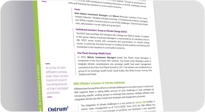 TCFD REPORT 2021 TACKLING CLIMATE CHANGE 26 PUTTING CLIMATE AT THE HEART OF OUR BUSINESS STRATEGY Contribution to global climate change initiatives Global initiatives NIM participates in various international forums and initiatives focusing on climate change from thestandpoint of asset managers and investors. These include: UN-PRI, Ceres Investor Network, Investor Leadership Network (ILN), Focusing Capital on the Long Term (FCLT) and One Planet Sovereign Wealth Funds (One Planet SWF) as well as the Institutional Investors’ Group on Climate Change (IIGCC) which ensures NIM’s participation in three additional institutional investor networks: Global Investor Coalition on Climate Change, Climate Action 100+ (Mirova isalso a live member) and The Investor Agenda. Through its participation in the above forums, NIM contributes to furthering discussion on all ESG challenges, climate risksandfinancingthetransitiontoalow-carboneconomy. Ceres Both Natixis Investment Managers and Mirova Mirovaare members of the Ceres Investor Network. The latter includes more than 175 institutional investors, managing over $29tn in assets. Ceres focuses on a set of ESG challenges. These include climate risks,deforestation,humanrightsandgovernance. Institutional Investors’ Group on Climate Change (IIGCC) The IIGCC has more than 230 members who manage over $30tn in assets. In respect to this group, Natixis Investment Managers is represented by its subsidiary, Ostrum AM. IIGCC works closely with companies and policymakers on climate change issues. In particular, the body focuses on building climate resilience and driving new investment in the transition to a lowcarbon economy. One Planet Sovereign Wealth Funds In 2019, Natixis Investment Managers joined One Planet Asset Managers, a component of the One Planet SWF initiative. One Planet Asset Managers seeks to integrate climate considerations into sovereign wealth fund asset management. Launched at the Paris One Planet Summit in 2017, the initiative was established by a group of six sovereign wealth funds: Saudi Arabia, Abu Dhabi, Kuwait, Norway, New Zealand and Qatar. NIM affiliates’ inclusion of climate challenges Affiliates have focused their efforts on climate challenges for a number of years. Furthermore, NIM supports them in taking better account of such challenges in their strategies by introducing specific working groups to exchange best practices. Multiple affiliates have integrated climate into their investment strategies and engagement processes. The integration of climate challenges is a top priority for Ostrum AM (€448bn in assets under management as of 12/31/2020). Since 2019, the NIM affiliate has reviewed the carbon measurement of portfolios and developed a new alignment methodology with the IPCC temperature scenarios. As such, Ostrum AM can report to its clients on the impact of their investment portfolio. Dedicated training courses have been set up, and the climate theme is systematically integrated into discussions with issuer management. DNCA (€26bn in assets under management as of 12/31/2020) recognizes the importance and urgency of climate challenges. To this end, the firm has integrated such challenges into its investment approach by systematically analyzing of issuer 14 of the 23 NIM affiliates already steer their carbon footprint and/or the temperature of their managed portfolios