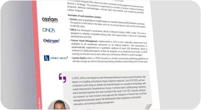 TCFD REPORT 2021 TACKLING CLIMATE CHANGE 44 CLIMATE-RELATED RISK MANAGEMENT ASSET MANAGEMENT ACTIVITIES Natixis Investment Managers has identified climate risks as a key challenge and seeks to ensure better understanding to support sectors and companies working towards the transition and impact investing. A working group was arranged, including the representatives of the federation and affiliates. It meets on a monthly basis and promotes shared best practices. Most affiliates integrate ESG criteria into their investment and engagement processes (see Section 2. Strategy). This practice is supported by a number of actions: rolling out training programs, defining methodologies, climate data improvement and measuring portfolio carbon footprint. Examples of such practices include: • Ossiam uses a quantitative model based on machine learning (ESG Machine Learning). The goal is to find links in thedata, such as recurring impacts, and use this information to identify risks. • DNCA has developed a proprietary Above & Beyond Analysis (ABA) model. The tool is designed to identify companies facing risks and opportunities in terms of sustainable development and ESR. • Ostrum Asset Management implemented in 2019 a new materiality assessment tool available to all investment personnel on an internal platform. This assessment is systematically supported by a qualitative analysis of each ESG dimension, which is outlined in a dedicated reports written by analysts, on an issuer by issuer basis. In 2020, training on climate issues and carbon accounting was offered to asset managers. • Loomis Sayles which, in 2020, focused on climate concerns by publishing guidelines on climate change as well as introducing training initiatives and working with climate data. In 2019, AEW co-developed an audit framework allowing to assess projected climate risks impact on a building and propose impact reduction measures. Over 2019-2020, we have conducted a pilot study on climate risk financial impact on a sample of ten buildings with varied characteristics located across Europe. A climate expert, building design engineers, and a technical expertise firm were involved in this study. From 2021 onwards, acting on our proposal, our main investors have approved the integration of climate risk in portfolio management processes across the following key steps: acquisition, construction, renovation, and existing building management. Thierry Laquitaine Director and Head of SRI, AEW smart sustainable solutions