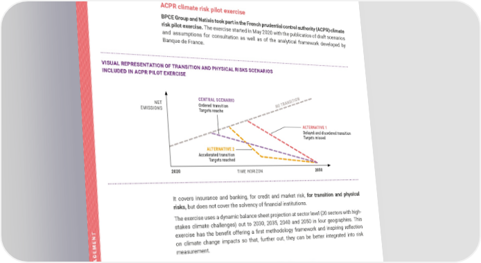 TCFD REPORT 2021 TACKLING CLIMATE CHANGE 46 CLIMATE-RELATED RISK MANAGEMENT Presentation of stress tests completed by BPCE Group to assess the impact of climate risks ACPR climate risk pilot exercise BPCE Group and Natixis took part in the French prudential control authority (ACPR) climate risk pilot exercise. The exercise started in May 2020 with the publication of draft scenarios and assumptions for consultation as well as of the analytical framework developed by Banque de France. It covers insurance and banking, for credit and market risk, for transition and physical risks, butdoesnotcoverthesolvencyoffinancialinstitutions. The exercise uses a dynamic balance sheet projection at sector level (20 sectors with high- stakes climate challenges) out to 2030, 2035, 2040 and 2050 in four geographies. This exercise has the benefit offering a first methodology framework and inspiring reflection on climate change impacts so that, further out, they can be better integrated into risk measurement. Key take-aways from ACPR climate risk pilot exercise Regarding credit risk, this methodology led to considerations related to the methodological framework and to the identification of required preparatory work on these exercises to overcome several difficulties. The latter were linked to the difference between sector classifications used by the ACPR and for internal classifications and to the fact that internal portfolio projection methodologies were in part not adapted for long time horizons. 4 VISUAL REPRESENTATION OF TRANSITION AND PHYSICAL RISKS SCENARIOS INCLUDED IN ACPR PILOT EXERCISE NO TRANSITION CENTRAL SCENARIO Ordered transition Targets reache ALTERNATIVE 1 Delayed and disordered transition Targets missed ALTERNATIVE 2 Accelerated transition Targets reached TIME HORIZON NET EMISSIONS 2020 2050