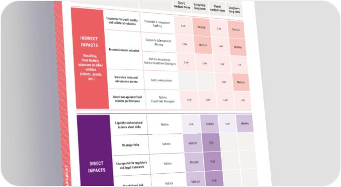 TCFD REPORT 2021 TACKLING CLIMATE CHANGE 38 CLIMATE-RELATED RISK MANAGEMENT IMPACTS SCOPE CONCERNED TRANSITION RISK ACUTE/CHRONIC PHYSICAL RISK Short/ medium-term Long/very long-term Short/ medium-term Long/very long-term INDIRECT IMPACTS Resulting from Natixis exposure to other entities (clients, assets, etc.) Counterparty credit quality and collateral valuation Corporate & Investment Banking Low Medium Low Medium Financial assets valuation Corporate & Investment Banking Low Medium Low Medium Natixis Assurances, Natixis Investment Managers Low Low Low Low Insurance risks and reinsurance access Natixis Assurances Low Medium Asset management fund relative performance Natixis Investment Managers Low Low Low Low DIRECT IMPACTS Liquidity and structural balance sheet risks Natixis Low Medium Low Medium Strategic risks Natixis Medium High Changes to the regulatory and legal framework Natixis Medium High Reputational risk Natixis Medium High Operational risk Natixis Low Medium Summary of the assessment of climate risk impact on Natixis’ businesses