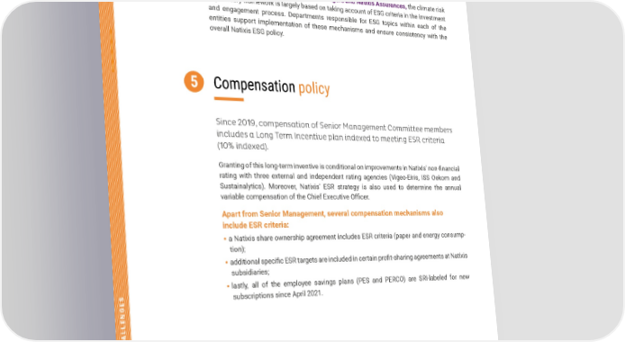 11 GOVERNANCE OF CLIMATE CHALLENGES TCFD REPORT 2021 TACKLING CLIMATE CHANGE Natixis’ Risk division will soon strengthen these measures by establishing a department in charge of climate risks with the mandate of coordinating the rollout of the framework applicable to climate risk. This department will work alongside the other risk departments and other internal stakeholders with a view to introducing consistent and exhaustive monitoring of such risks. Further out, it will also review high-stakes transactions from the climate risk appetite perspective as well as monitoring asset portfolio exposure to climate risks and internal and external reporting of these risks. With respect to Natixis Investment Managers and Natixis Assurances, the climate risk supervisory framework is largely based on taking account of ESG criteria in the investment and engagement process. Departments responsible for ESG topics within each of the entities support implementation of these mechanisms and ensure consistency with the overall Natixis ESG policy. Compensation policy Since 2019, compensation of Senior Management Committee members includes a Long Term Incentive plan indexed to meeting ESR criteria (10% indexed). Granting of this long-term inventive is conditional on improvements in Natixis’ non-financial rating with three external and independent rating agencies (Vigeo-Eiris, ISS Oekom and Sustainalytics). Moreover, Natixis’ ESR strategy is also used to determine the annual variablecompensationoftheChiefExecutiveOfficer. Apart from Senior Management, several compensation mechanisms also include ESR criteria: • a Natixis share ownership agreement includes ESR criteria (paper and energy consump - tion); • additional specific ESR targets are included in certain profit-sharing agreements at Natixis subsidiaries; • lastly, all of the employee savings plans (PES and PERCO) are SRI-labeled for new subscriptionssinceApril2021. Creation of a climate risk department 5