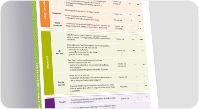 TCFD REPORT 2021 TACKLING CLIMATE CHANGE 14 PUTTING CLIMATE AT THE HEART OF OUR BUSINESS STRATEGY Scope Business activity Business opportunity Climate risk mitigation Current level of development Level of impact ASSET AND WEALTH MANAGEMENT Third party asset management Outperformance of investment strategies: • Responsible investment (including climate in risk analysis) • Sustainable investment (exclusions, best-in-class/universe) • Specific climate-themed strategies • Seed money investment in green/climate funds Transition and physical risk *** *** Growing revenues from developing climate-related strategies in line with client demand: • climate theme investment strategies • real asset investments (renewable energy, sustainable transport, real estate, other transition/adaptation infrastructure) • growing asset sustainable certification (for real estate in particular) Transition and physical risk ** *** Engagement Client engagement and advisory on climate transition Transition risk ** *** • Issuer engagement on climate transition • Voting policy in line with climate mitigation issues Physical risk * ** Wealth management Distribution of climate-related investment products in line with client demand (sustainable, thematic, impact, real asset investments) Transition and physical risk * * INSURANCE Life insurance Outperformance of general fund due to sustainable investment policy: exclusions, 1.5°C alignment target by 2030, climate-themed investments. Transition risk *** *** Increased revenues from the development of green/climate-related insurance products in line with client demand: • sustainable unit trust offering • responsible retirement savings plan (PERI) • green life insurance contracts Transition risk ** ** New clients from increased engagement on climate transition/adaptation issues with: • Issuers: voting policy taking into account climate challenges • Asset managers • Client advisory related to green/climate theme investments. Transition and physical risk * ** Non-life insurance • Client advisory on transition • Development of home/car insurance products with incentive for energy savings and carbon footprint reduction Transition risk * * Growing client advisory on climate theme issues (prevention actions including weather alerts, advice on adaptation needs, resilient claims management) Physical risk * *** NATIXIS CORPORATE Treasury Outperformance of liquidity investment thanks to the implementation of sustainable investment criteria Transition risk * ** Direct impacts • Actions to improve energy efficiency of office buildings and reduce corresponding energy cost in all locations (renovation, relocation) • Long-term renewable power purchase agreements (PPA) in all locations • Continued development of home office and remote working solutions Transition risk ** * Direct impacts Actions to improve resilience of office buildings in all locations (renovation, relocation) Physical risk/ Operational risk *** * Staff onboarding Training of staff on environmental issues (climate, energy, waste, water, biodiversity) All climate risks *** *