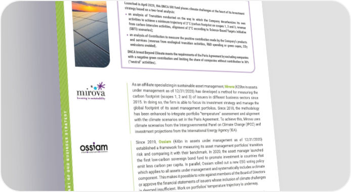 TCFD REPORT 2021 TACKLING CLIMATE CHANGE 27 PUTTING CLIMATE AT THE HEART OF OUR BUSINESS STRATEGY risks and opportunities. Thisanalysis is based on a company-specific proprietary model. Through this approach, DNCA assesses (i) companies’ exposure to physical climate and transition risks according to their sector and geographic footprint and (ii) their strategy to transition and adapt to climate change. DNCA also develops climate theme funds. DNCA INVEST BEYOND CLIMATE Launched in April 2020, this DNCA SRI fund places climate challenges at the heart of its investment strategy based on a two-level analysis: • an analysis of Transition conducted on the way in which the Company decarbonizes its own activities to achieve a minimum trajectory of 2°C (carbon footprint on scopes 1, 2 and 3, revenue from carbon-intensive activities, alignment of 2°C according to Science-Based Targets initiative (SBTi) scenarios); • an analysis of Contribution to measure the positive contribution made by the Company’s products and services (revenue from ecological transition activities, R&D spending or green capex, CO 2 emissions avoided). DNCA Invest Beyond Climate meets the requirements of the Paris Agreement by excluding companies with a negative green contribution and limiting the share of companies without contribution to 30% (“neutral” activities). As an affiliate specializing in sustainable asset management, Mirova (€20bn in assets under management as of 12/31/2020) has developed a method for measuring the carbon footprint (scopes 1, 2and 3) of issuers in different business sectors since 2015. In doing so, the firm is able to focus its investment strategy and manage the global footprint of its asset management portfolios. Since 2018, the methodology has been enhanced to integrate portfolio “temperature” assessment and alignment with the climate scenarios set in the Paris Agreement. To achieve this, Mirova uses climate scenarios from the Intergovernmental Panel on Climate Change (IPCC) and investment projections from the International Energy Agency (IEA). Since 2019, Ossiam (€4bn in assets under management as of 12/31/2020) established a framework for measuring its asset management portfolios’ transition risk and comparing it with their benchmark. In 2020, the asset manager launched the first low-carbon sovereign bond fund to promote investment in countries that emit less carbon per capita. In parallel, Ossiam rolled out a new ESG voting policy which applies to all assets under management and systematically includes a climate component. This makes it possible to vote against members of the Board of Directors or approve the financial statements of issuers whose inclusion of climate challenges isdeemedinsufficient.Workonportfolios’temperaturetrajectoryisunderway. Real estate asset management specialists, AEW CILOGER (€34bn in assets under management as of 12/31/2020) and AEW Capital Management (€21bn in assets under management as of 12/31/2020), integrate transition risks throughout the investment lifecycle. The climate impact of portfolio buildings is systematically assessed and managed on an annual basis by measuring their energy use (an increasing proportion of the real estate portfolio is equipped with remote reading meters) and share of energy used from renewable sources as well as water use and waste management. smart sustainable solutions
