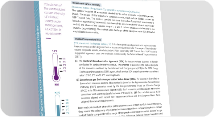 TCFD REPORT 2021 TACKLING CLIMATE CHANGE 58 METRICS AND TARGETS USED BY NATIXIS TO MONITOR CLIMATE RISKS AND OPPORTUNITIES For corporate assets, climate indicators have been calculated for NIM's aggregated portfolio on the one hand and for a composite benchmark index on the other. This enables a comparison of NIM's performance with that of the market. This benchmark index is composed of the MSCI All Country World Index (MSCI ACWI) (50%) and the Bloomberg BarclaysGlobalAggregateindex(50%). NIM uses the following four indicators to monitor the climate impact of its aggregated portfolios Investment carbon intensity (measured in tons of equivalent CO 2 per million euros invested, tCO 2 e/€m) The carbon footprint of investment divided by the value of assets under management (AuM). The scope of this indicator is corporate assets, which include €515bn covered by S&P Trucost data. The method used to calculate the carbon footprint of investments is based on apportioning between (i) the share of the investment in the value of each issuer and (ii) the share of the issuer's scope 1, 2 and 3 carbon emissions attributable to the investor (apportioning). The method uses the larger of the enterprise value (EV) or market capitalization as a metric. Implied Temperature Rise (ITR, measured in degrees Celsius, °C) Calculates portfolio alignment with a given climate trajectory measured in degrees Celsius above preindustrial levels. The scope of this indicator covers corporate assets, which include €476bn covered by S&P Trucost data. S&P Trucost’s suggested approach uses two methods introduced by the Science-Based Targets initiative (SBTi): (i) The Sectoral Decarbonization Approach (SDA) for issuers whose business is largely conducted in carbon-intensive sectors. This method is based on the carbon budgets of the scenarios outlined by the International Energy Agency (IEA) in the 2017 Energy Technology Perspectives (ETP) report, which provide SDA analysis parameters consistent with 1.75°C, 2°C and 2.7°C warming levels. (ii) Greenhouse gas Emissions per unit of Value Added (GEVA) for issuers in diversified or low-carbon intensive sectors. This method is based on the Representative Concentration Pathway (RCP) scenarios used by the Intergovernmental Panel on Climate Change (IPCC) in its fifth Assessment Report (AR5). Such scenarios provide analysis parameters consistent with warming levels between 2°C and 5°C. S&P Trucost also uses a 1.5°C scenario aligned with recent SBTi recommendations and the European Union Paris- Aligned Benchmark requirements. Both methods conduct a transition pathway assessment of each portfolio issuer. Moreover, they review the adequacy of projected emission reductions compared against a carbon budget that is compatible with a range of temperature increase scenarios. Issuers’ scope 3 emissions are not taken into account. The difference between issuer trajectory and target scenario is then converted into an equivalent temperature. Each issuer’s trajectory assessment uses historic data collected over six years (business activity and carbon emissions) and forward-looking projections over a six-year timeframe. When applied to aggregated asset management portfolios, S&P Trucost’s research method produces resultsmeasuredinatemperaturerange:<1.5°Cand1.75°C,<2°C,<2.7°Cand3°C,>3°C. < 3°C 5°C 4°C 3°C NIM 1°C 2°C 5°C 4°C 3°C > 3°C Benchmark 1°C 2°C Calculation of the consolidated carbon intensity of all liquid assets under management, i.e. €515bn in investments