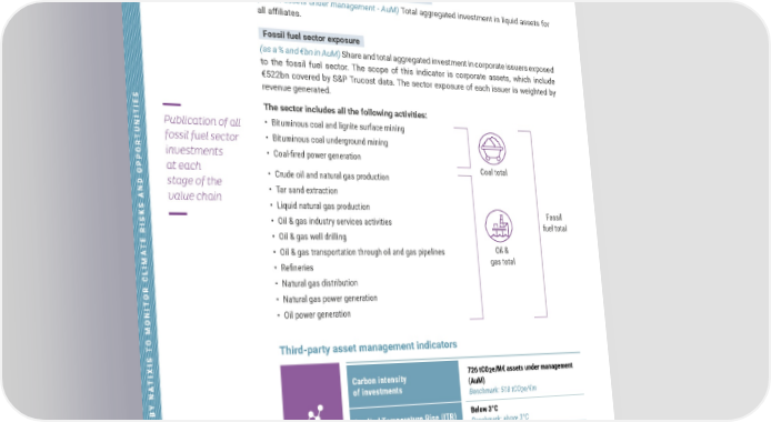 TCFD REPORT 2021 TACKLING CLIMATE CHANGE 59 METRICS AND TARGETS USED BY NATIXIS TO MONITOR CLIMATE RISKS AND OPPORTUNITIES KEY POINT Methods that measure investment portfolio temperature trajectory are still relatively new and are being constantly updated. They are based on multiple hypothetical scenarios. The resulting Implied Temperature Rise (ITR) indicator may differ considerably depending on the method and data used as well as the scenarios retained. Total investment in green and sustainable bonds (€bn in assets under management - AuM) Total aggregated investment in liquid assets for allaffiliates. Fossil fuel sector exposure (as a % and €bn in AuM) Share and total aggregated investment in corporate issuers exposed to the fossil fuel sector. Thescope of this indicator is corporate assets, which include €522bn covered by S&P Trucost data. The sector exposure of each issuer is weighted by revenue generated. The sector includes all the following activities: • Bituminous coal and lignite surface mining • Bituminous coal underground mining • Coal-fired power generation • Crude oil and natural gas production • Tar sand extraction • Liquid natural gas production • Oil & gas industry services activities • Oil & gas well drilling • Oil & gas transportation through oil and gas pipelines • Refineries • Natural gas distribution • Natural gas power generation • Oil power generation Third-party asset management indicators Carbon intensity of investments 726 tCO 2 e/M€ assets under management (AuM) Benchmark: 518 tCO 2 e/€m Implied Temperature Rise (ITR) Below 3°C Benchmark: above 3°C Green and sustainable bond investments €18.5bn AuM Exposure to carbon-intensive sectors: thermal coal and fossil fuel Thermal coal: 0.2% of AuM (€1.04bn) Benchmark: 0.51% of the index Fossil fuel: 4.44% of AuM (€23.2bn) Benchmark: 6.43% of the index Publication of all fossil fuel sector investments at each stage of the value chain Coal total Fossil fuel total Oil & gas total 2020 METRICS