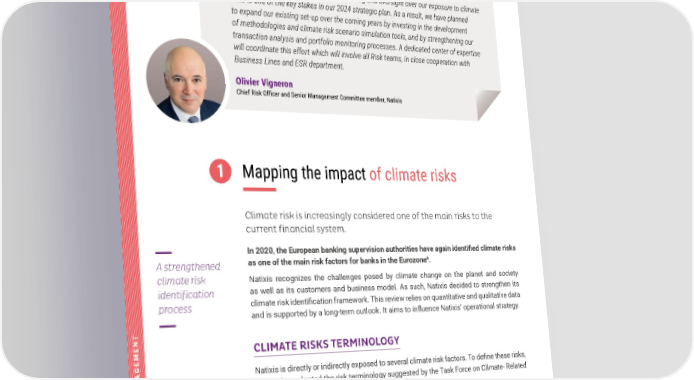 TCFD REPORT 2021 TACKLING CLIMATE CHANGE 34 CLIMATE-RELATED RISK MANAGEMENT As a financial institution operating across four business lines, Natixis is exposed in many ways to climate change related risks. Due to their distinctive characteristics, physical and transition risks are particularly complex to understand. They imply forecasting over much longer time horizons than those we are used to consider, and collection of new datasets on our counterparties and financed assets. For the Risk division, improving understanding and oversight over our exposure to climate risks is one of the key stakes in our 2024 strategic plan. As a result, we have planned to expand our existing set-up over the coming years by investing in the development of methodologies and climate risk scenario simulation tools, and by strengthening our transaction analysis and portfolio monitoring processes. A dedicated center of expertise will coordinate this effort which will involve all Risk teams, in close cooperation with Business Lines and ESR department. Olivier Vigneron Chief Risk Officer and Senior Management Committee member, Natixis Mapping the impact of climate risks Climate risk is increasingly considered one of the main risks to the current financial system. In 2020, the European banking supervision authorities have again identified climate risks as one of the main risk factors for banks in the Eurozone 6 . Natixis recognizes the challenges posed by climate change on the planet and society as well as its customers and business model. As such, Natixis decided to strengthen its climate risk identification framework. This review relies on quantitative and qualitative data andissupportedbyalong-termoutlook.ItaimstoinfluenceNatixis’operationalstrategy. CLIMATE RISKS TERMINOLOGY Natixis is directly or indirectly exposed to several climate risk factors. To define these risks, Natixis has adopted the risk terminology suggested by the Task Force on Climate- Related Financial Disclosures (TCFD). • Acute physical risks refer to direct losses that are driven by extreme weather events, including the damage they may cause in the destruction of physical assets (real estate and/or production), the decline in local economic activity and, potentially, disruption of value chains. A strengthened climate risk identification process 1 6. https://www.bankingsupervision.europa.eu/banking/priorities/risk_assessment/html/index.fr.html