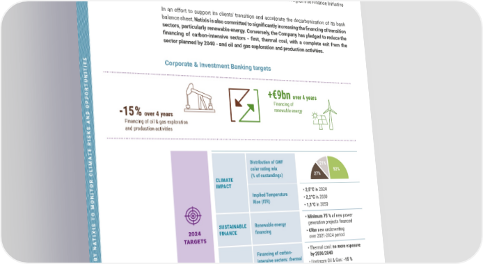 TCFD REPORT 2021 TACKLING CLIMATE CHANGE 56 METRICS AND TARGETS USED BY NATIXIS TO MONITOR CLIMATE RISKS AND OPPORTUNITIES As part of the BPCE 2024 strategic plan, the GWF has enabled the setting of targets for all Natixis activities. The GWF has also identified targets for each business line, sector and geography using two main indicators: first, the mix of GWF ratings and second, the bank balance sheet temperature trajectory. Through the ambitious targets set by Corporate & Investment Banking, which accounts for the majority of the carbon emissions financed by BPCE Group, the Company has committed to achieving carbon neutrality by 2050. Natixis has also pledged to join the Net Zero Banking Alliance initiative, which brings together 63 global banks convened by the United Nations Environment Programme Finance Initiative (UNEP FI) 17 . In an effort to support its clients' transition and accelerate the decarbonization of its bank balance sheet, Natixis is also committed to significantly increasing the financing of transition sectors, particularly renewable energy. Conversely, the Company has pledged to reduce the financing of carbon-intensive sectors - first, thermal coal, with a complete exit from the sector planned by 2040 - and oil and gas exploration and production activities. Corporate & Investment Banking targets CLIMATE IMPACT Distribution of GWF color rating mix (% of oustandings) Implied Temperature Rise (ITR) • 2,5°C in 2024 • 2,2°C in 2030 • 1,5°C in 2050 SUSTAINABLE FINANCE Renewable energy financing • Minimum 75 % of new power generation projects financed • €9bn new underwriting over 2021-2024 period TRANSITION RISK Financing of carbon- intensive sectors: thermal coal and oil & gas • Thermal coal: no more exposure by 2030/2040 • Upstream Oil & Gas: -15 % reduction Share of Oil & Gas exposure rated “brown” with GWF methodology (% of oustandings) 66 % 2050 carbon neutrality target and intermediate 2024 and 2030 targets 17. 63 banks in october 2021 – https://www.unepfi.org/net-zero-banking/ Financing of oil & gas exploration and production activities -15% over 4 years Financing of renewable energy +€9bn over 4 years 2024 TARGETS 27 % 41 % 52% 31% 21 % 38 % 27% 52% 21%