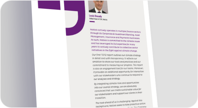 Louis Douady Global Head of ESR, Natixis Natixis actively operates in multiple finance sectors through its Corporate & Investment Banking, Asset Management, Insurance and Payments businesses. As such, Natixis is committed to the climate cause and has leveraged its full expertise for many years to actively contribute to collective sector initiatives in the fight against climate change. Our first TCFD report outlines our climate strategy in detail and with transparency. It reflects our ambition to share our tools and practices and our commitment to measuring our progress. This report is also an engagement tool for our teams. Moreover, it provides an additional opportunity for interaction with our stakeholders who continue to respond to our analyses and strategy. By integrating climate risks and opportunities into our overall strategy, we are absolutely convinced that we create sustainable value for our stakeholders and support our clients in their transition. The task ahead of us is challenging. Against this background, Natixis seeks to take proactive action while remaining humble in its efforts. The Company recognizes the necessity of regular and in-depth reviews in an endeavor to improve its individual performance and collectively contribute to meeting this large-scale challenge, both for our generation and generations to come.
