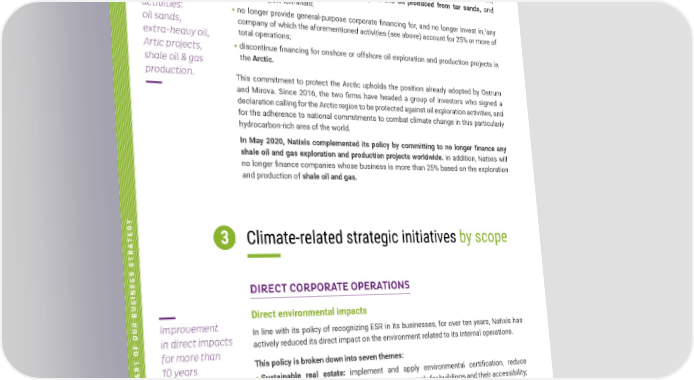 TCFD REPORT 2021 TACKLING CLIMATE CHANGE 17 PUTTING CLIMATE AT THE HEART OF OUR BUSINESS STRATEGY 1. This applies to all Natixis Assurances investments Oil and gas industry In December 2017, Natixis committed to withdrawing from financing oil operations and production produced from tar sands and oil from the Arctic. In November 2018, Natixis published an oil and gas sector policy setting out the terms of its commitment, namely to: • discontinue the financing of worldwide projects involving the exploration, production, transportation and storage of extra-heavy oil and oil produced from tar sands, and related export terminals; • no longer provide general-purpose corporate financing for, and no longer invest in, 1 any company of which the aforementioned activities (see above) account for 25% or more of total operations; • discontinue financing for onshore or offshore oil exploration and production projects in the Arctic. This commitment to protect the Arctic upholds the position already adopted by Ostrum and Mirova. Since 2016, the two firms have headed a group of investors who signed a declaration calling for the Arctic region to be protected against oil exploration activities, and for the adherence to national commitments to combat climate change in this particularly hydrocarbon-rich area of the world. In May 2020, Natixis complemented its policy by committing to no longer finance any shale oil and gas exploration and production projects worldwide. In addition, Natixis will no longer finance companies whose business is more than 25% based on the exploration and production of shale oil and gas. Climate-related strategic initiatives by scope DIRECT CORPORATE OPERATIONS Direct environmental impacts In line with its policy of recognizing ESR in its businesses, for over ten years, Natixis has actively reduced its direct impact on the environment related to its internal operations. This policy is broken down into seven themes: • Sustainable real estate: implement and apply environmental certification, reduce consumption, and ensure a carbon-free energy supply for buildings and their accessibility; • Responsible digital technology: reduce the impact of digital technology by limiting the number of IT devices, integrate eco-design into each IT solution, and use digital technology to achieve sustainable development goals; • Promotion of sustainable mobility: support the use of bicycles, encourage teleworking and remote working to reduce travel, facilitate the use of electric vehicles, support the use Exclusion of high-emission activities: oil sands, extra-heavy oil, Artic projects, shale oil & gas production. 3 Improvement in direct impacts for more than 10 years