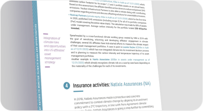 TCFD REPORT 2021 TACKLING CLIMATE CHANGE 61 METRICS AND TARGETS USED BY NATIXIS TO MONITOR CLIMATE RISKS AND OPPORTUNITIES • AEW Capital Management (real estate, €21bn in AuM as of 12/31/2020) which integrates climate risks throughout its investment and asset management cycle and monitors environmental impact indicators for approximately half of its US real estate portfolio. With respect to this portfolio, AEW has set an average target of a 1.5% year-on-year reduction in water and energy consumption, GHG emissions (scopes 1 and 2) and waste production by 2020. In 2019, GHG emissions for these portfolios declined 2.1% compared with the previous year. As of 2021, AEW plans to strengthen its annual GHG reduction target to 2.5%, in line with the SBTi targets for the real estate sector. • Vauban Infrastructures Partners (infrastructure, €5bn in AuM as of 12/31/2020) which assesses carbon footprint for its scope 1, 2 and 3 portfolio assets on an annual basis. Based on this assessment, the affiliate identifies action drivers to reduce and prevent GHG emissions. Vauban Infrastructure Partners is also able to initiate dialog with contributing companies regarding actions and discuss offsetting solutions for unavoidable emissions. • Naxicap Partners (private equity, €4bn in AuM as of 12/31/2020) which for the first time in 2020, published GHG emissions (including scope 3) forall of its portfolio companies (PwC model covering the entire value chain). The calculation was made for 88% of assets under management. Average carbon intensity for the portfolio totaled 250 tCO 2 e/€m invested. Spearheaded by a cross-functional climate working group created by NIM in 2019 with the goal of sensitizing, informing and developing affiliates’ engagement in climate challenges, several US affiliates have kick-started efforts to measure the climate impact of their asset management portfolios. A case in point is Loomis Sayles (€284bn in AuM as of 12/31/2020) which has now integrated climate into its investment decision process and is planning to measure the carbon intensity and temperature trajectory of its asset management portfolios. Another example is Harris Associates (€85bn in assets under management as of 12/31/2020) which already recognizes climate risk on a case-by-case basis depending on the materiality of the challenges for each of its investments. Insurance activities: Natixis Assurances (NA) In 2018, Natixis Assurances made a proactive and concrete commitment to combat climate change by aligning its investment policy with a 2°C trajectory, in line with Paris Agreement climate targets. Today, Natixis Assurances is going a step further by committing to a 1.5°C trajectory. This commitment is supported by an annual “green” asset investment target of 10% to reach 10% of the target portfolio in 2030. Following the commitment made in 2018, targets are monitored on a quarterly basis. Integration of climate risks and opportunities into US affiliates’ asset management strategy 4