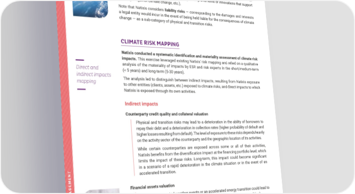 TCFD REPORT 2021 TACKLING CLIMATE CHANGE 35 CLIMATE-RELATED RISK MANAGEMENT • Chronic physical risks refer to direct losses driven by longer-term shifts in climate patterns (rising sea levels, chronic heatwaves, changes in precipitation patterns and increased variability, unavailability / disappearance of specific resources) which may gradually hamper productivity in a given sector. • Transition risks refer to the economic and financial impacts of implementing low-carbon business models (impossibility of exploiting more oil reserves, shift in consumer preferences from high-carbon products, sharp increase in production costs with the introduction of carbon pricing and energy taxes, technological improvements or innovations that support thefightagainstclimate change,etc.). Note that Natixis considers liability risks — corresponding to the damages and interests a legal entity would incur in the event of being held liable for the consequences of climate change — as a sub-category of physical and transition risks. CLIMATE RISK MAPPING Natixis conducted a systematic identification and materiality assessment of climate risk impacts. This exercise leveraged existing Natixis' risk mapping and relied on a qualitative analysis of themateriality of impacts by ESR and risk experts in the short/medium-term (<5years)andlong-term(5-30years). The analysis led to distinguish between indirect impacts, resulting from Natixis exposure to other entities (clients, assets, etc.) exposed to climate risks, and direct impacts to which Natixis is exposed through its own activities. Indirect impacts Counterparty credit quality and collateral valuation Physical and transition risks may lead to a deterioration in the ability of borrowers to repay their debt and a deterioration in collection rates (higher probability of default and higher losses resulting from default). The level of exposure to these risks depends heavily on the activity sector of the counterparty and the geographic location of its activities. While certain counterparties are exposed across some or all of their activities, Natixis benefits from the diversification impact at the financing portfolio level, which limits the impact of these risks. Long-term, this impact could become significant in a scenario of a rapid deterioration in the climate situation or in the event of an accelerated transition. Financial assets valuation Extreme or repeated weather events or an accelerated energy transition could lead to asharpcorrectioninthevaluationoffinancialassets(equities,commodities). In the long run, Natixis’ Global Markets business, specifically its commodities business line, could be exposed to significant loss risk linked to market events caused by climate change related risks. Furthermore, Natixis could also be impacted by its exposure to financial assets sensitive to climate risk held via the euro fund of Natixis Assurances or via seed Direct and indirect impacts mapping