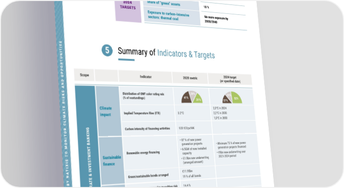 TCFD REPORT 2021 TACKLING CLIMATE CHANGE 64 METRICS AND TARGETS USED BY NATIXIS TO MONITOR CLIMATE RISKS AND OPPORTUNITIES thermal coal, by end-2021, Natixis Assurances has also committed to no longer integrating issuers into its portfolio who exceed one of the following thresholds: (i) 10 % of revenue achieved throughthermal coal(based onthe latest published financial statements), (ii) 10 milliontonsofcoalproducedand(iii)5GWofcoal-poweredinstalledcapacity. Implied Temperature Rise (ITR) 2°C in 2024 1,5°C in 2030 Share of "green" assets 10 % Exposure to carbon-intensive sectors: thermal coal No more exposure by 2030/2040 Summary of Indicators & Targets 5 Scope Indicator 2020 metric 2024 target (or specified date) CORPORATE & INVESTMENT BANKING Climate impact Distribution of GWF color rating mix (% of oustandings) Implied Temperature Rise (ITR) 3.2°C 2,5°C in 2024 2,2°C in 2030 1,5°C in 2050 Carbon intensity of financing activities 920 tCO 2 e/M€ Sustainable finance Renewable energy financing • 87 % of new power generation projects • 6.5GW of new installed capacity • €1.9bn new underwriting (arranged amount) • Minimum 75 % of new power generation projects financed • €9bn new underwriting over 2021-2024 period Green/sustainable bonds arranged €11.95bn 19 % of all bonds Transition risk Share of assets exposed to transition risk 14.4 % Thermal coal sector financing €394m No more exposure to coal sector by 2030/2040 Upstream Oil & Gas sector financing €5.8bn - 15 % reduction Share of Oil & Gas exposure rated “brown” with GWF methodology (% of oustandings) 76 % 66 % 2024 TARGETS 27% 52% 21% 41% 31% 28%